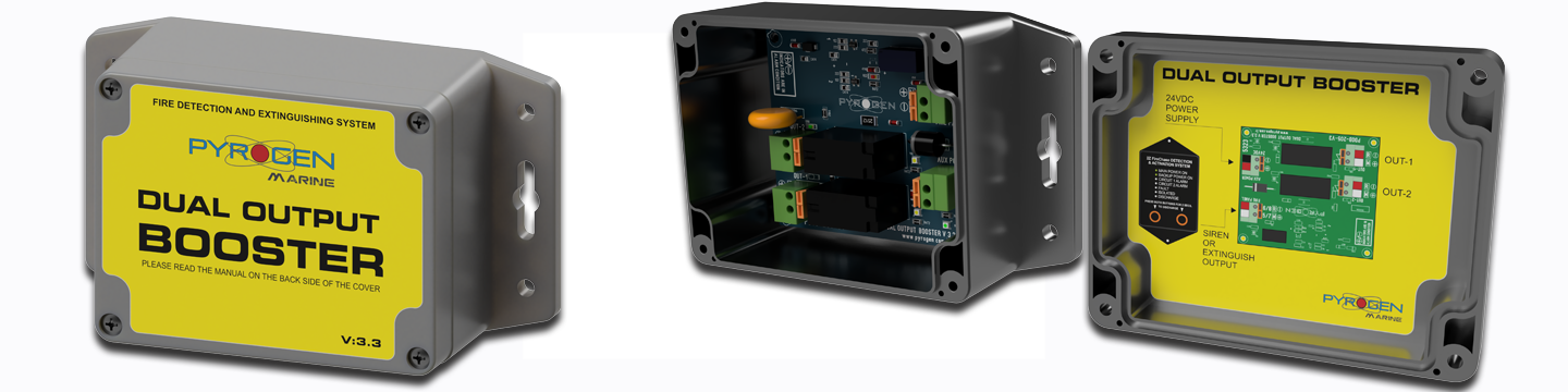 Yüksek akım ile sürülmesi gereken uyarı cihazlarını tetiklemekte yada 5 adedin üzerinde söndürücü kanister bağlantısı gerektiren uygulamalarda panelin çıkış akımını artırmak amaçlı kullanılır. Bir adet 24VDC besleme girişi, bir adet tetikleme girişi ve iki adet çıkışa sahiptir. Her iki çıkışta da hat sonu direncinin kontrolü için ledler bulunur. Her hangi bir hatta kopukluk olduğu taktirde çıkışın ledi söner ve panele arıza uyarısı verir. Besleme girişinde yüksek gerilim ve ters bağlantı koruması bulunur. |
